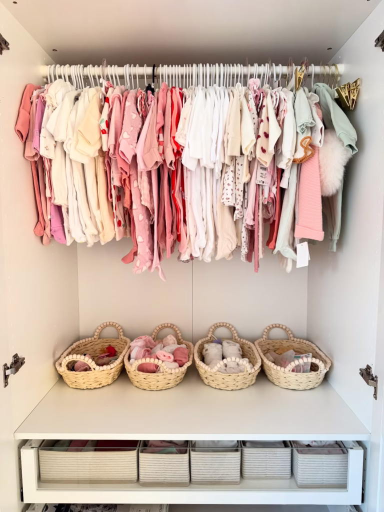 Hanging outfits by size helps parents grab the right piece quickly during busy mornings.
