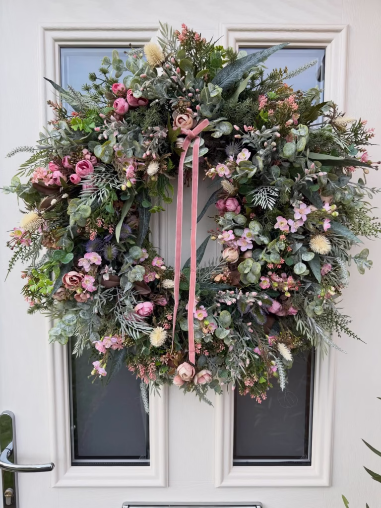A long, thin velvet ribbon in blush adds a soft, flowing movement to your front door.