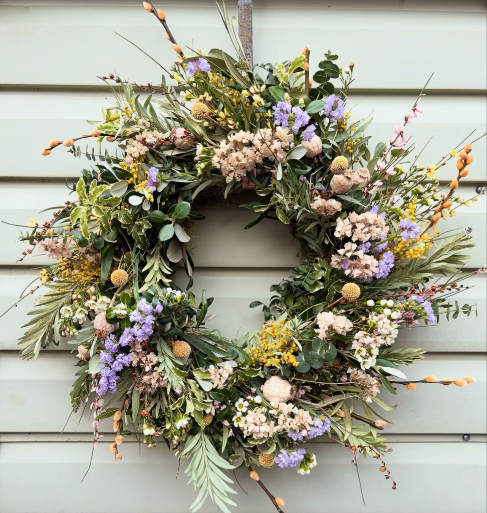 You can arrange brittle ferns, magenta statice, and pale strawflowers to create this messy, organic halo.