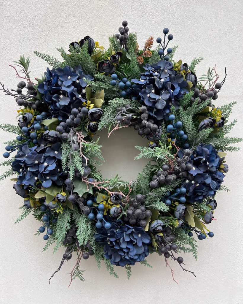 You can bring that stillness to your door by choosing large navy petals and dark berries that pop against evergreen sprigs.