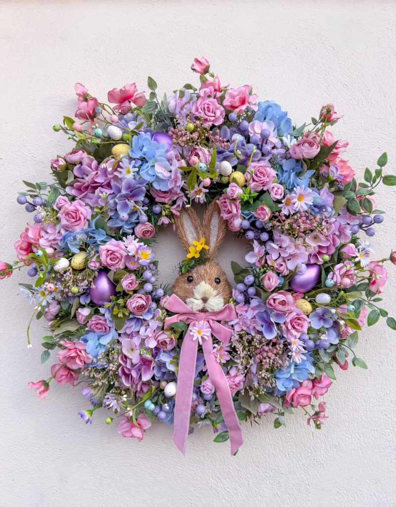 You can tuck a straw rabbit right into the center of a thick ring filled with lavender hydrangeas and silk roses.