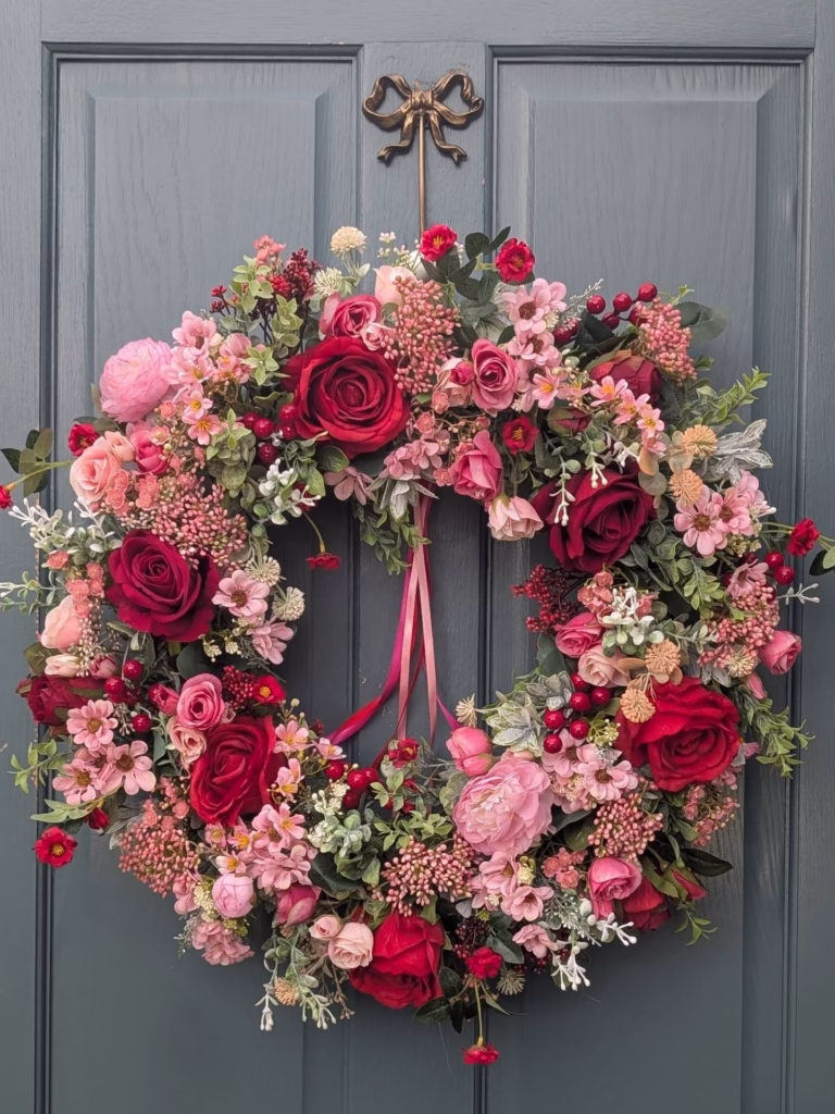 This design mixes bold red roses with soft pink blossoms and clusters of tiny berries to create a lush, layered circle.